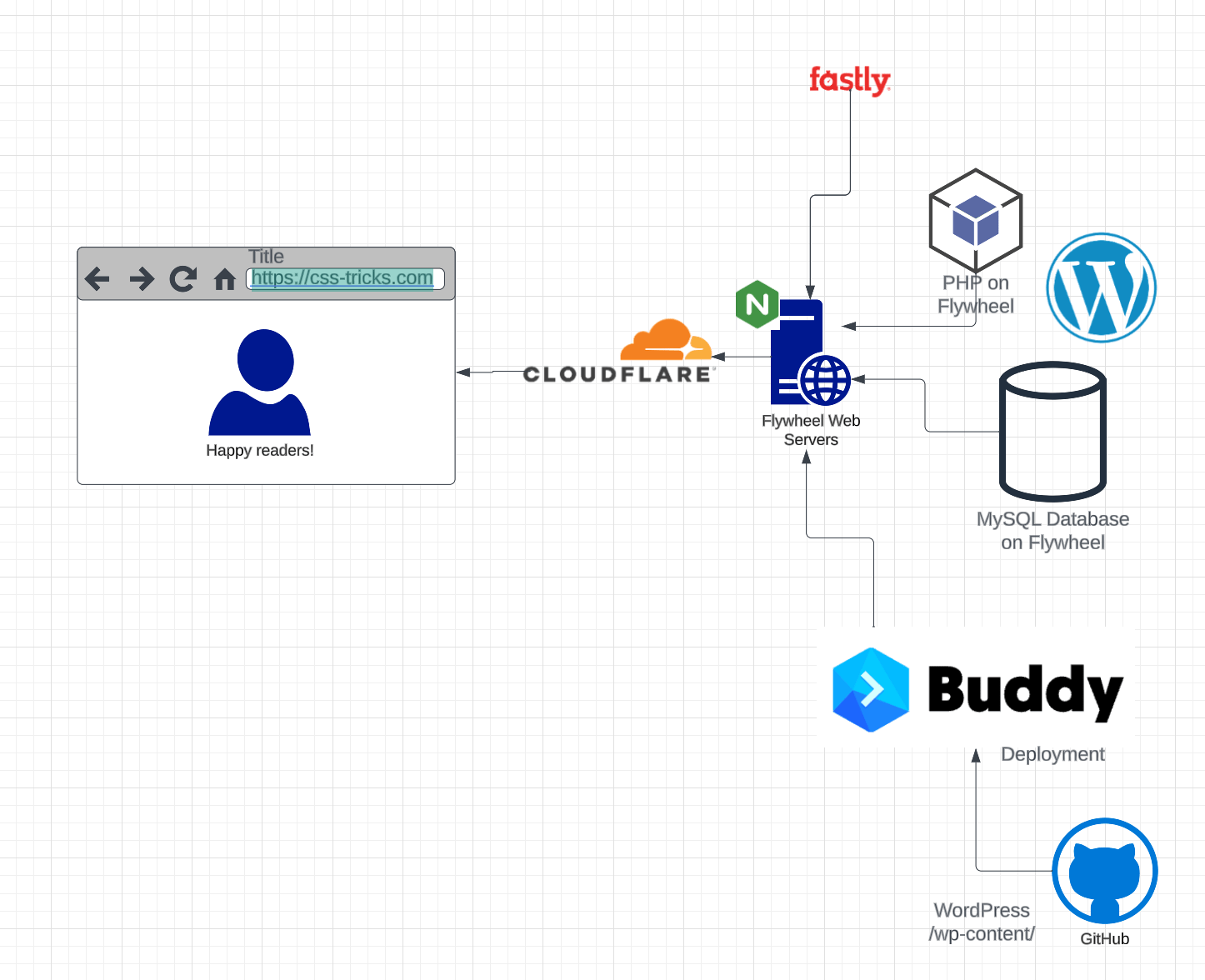 When I was in the process of selling CSS-Tricks to DigitalOcean, they wanted to understand the stack and basic architecture of the site. I was like: it’s a pretty basic WordPress deal: PHP, MySQL. Wait but there is a bit more to it. It’s hosted on Flywheel who do a little of their own stuff. Cloudflare is in front of it. I host the (most of) the code on GitHub. It deploys from there with Buddy. That’s a mouthful, so how about some boxes and arrows!