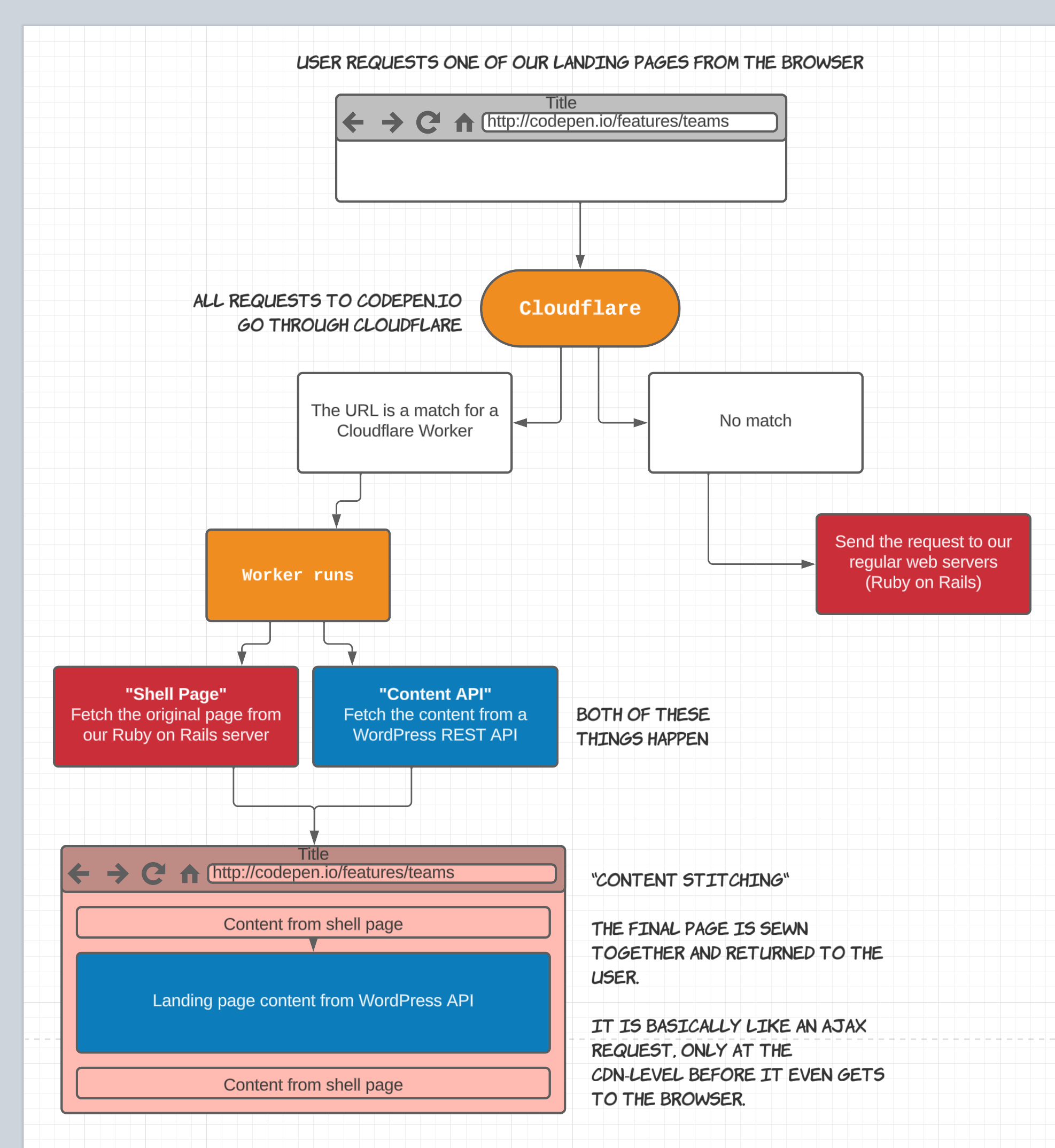 I once used LucidChart to explain how our landing pages work on CodePen where we host a “shell page” in one location and snag the content via API elsewhere and “stitch” them together.